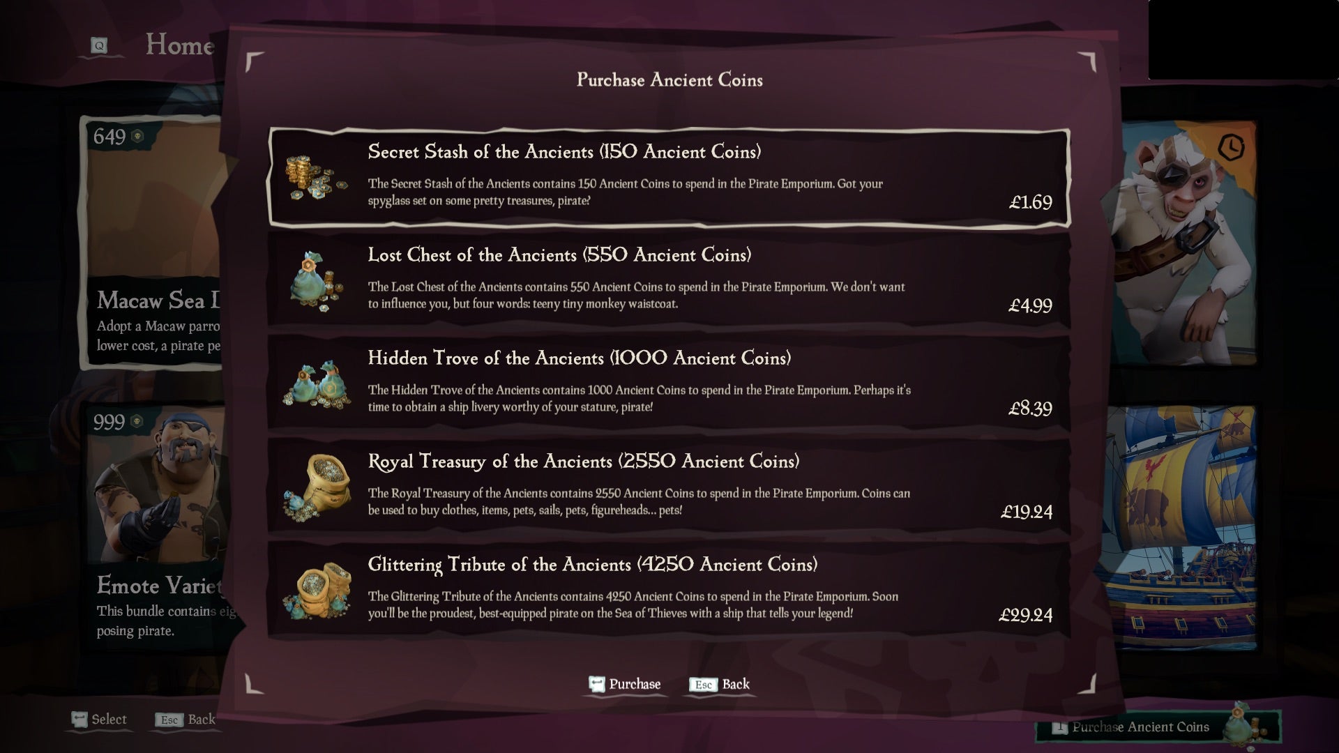 We had a few hints of how Sea of Thieves' microtransactions would stack up earlier this week when, during Mon's developer livestream, Rare displayed U.s. pricing for its premium currency, Ancient Coins. Now though, nosotros tin see Uk prices for Bounding main of Thieves' awkwardly sized Ancient Coins bundles, used to purchase items in the Pirate Emporium: