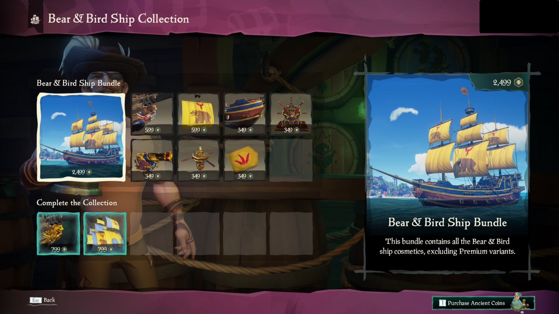 Easily the most egregious addition to the shop, however, comes in the class of Bounding main of Thieves' first paid ship cosmetic fix. These are due to refresh on a regular basis, with each one being themed around a archetype video game IP. The current offer, a Banjo-Kazooie set consisting of seven themed pieces - a figurehead, hull, sails, capstan, wheel, flag, and cannon - costs ii,499 Ancient Coins (close to £eighteen). Two "Collector'south" edition figurehead and sail variants bring the complete fix to around £25.
